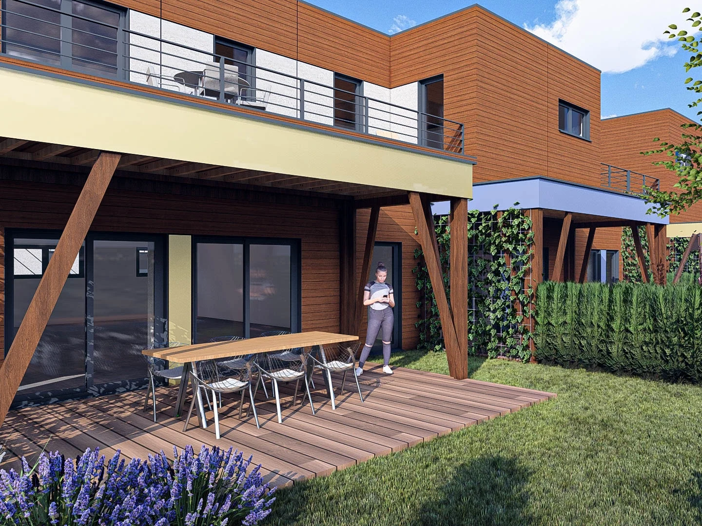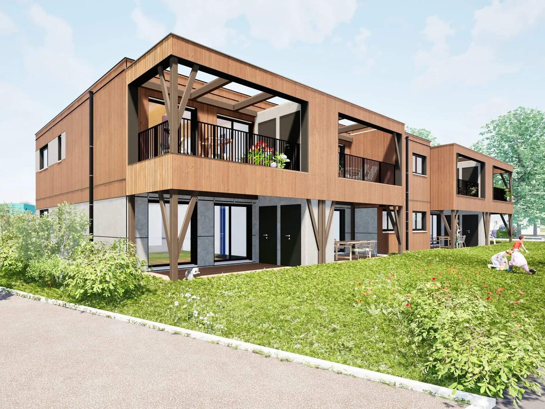Construits en ossature bois bas carbone avec des matériaux renouvelables et recyclables, ils offrent une isolation performante, une excellente qualité de l’air intérieur et une faible consommation énergétique.