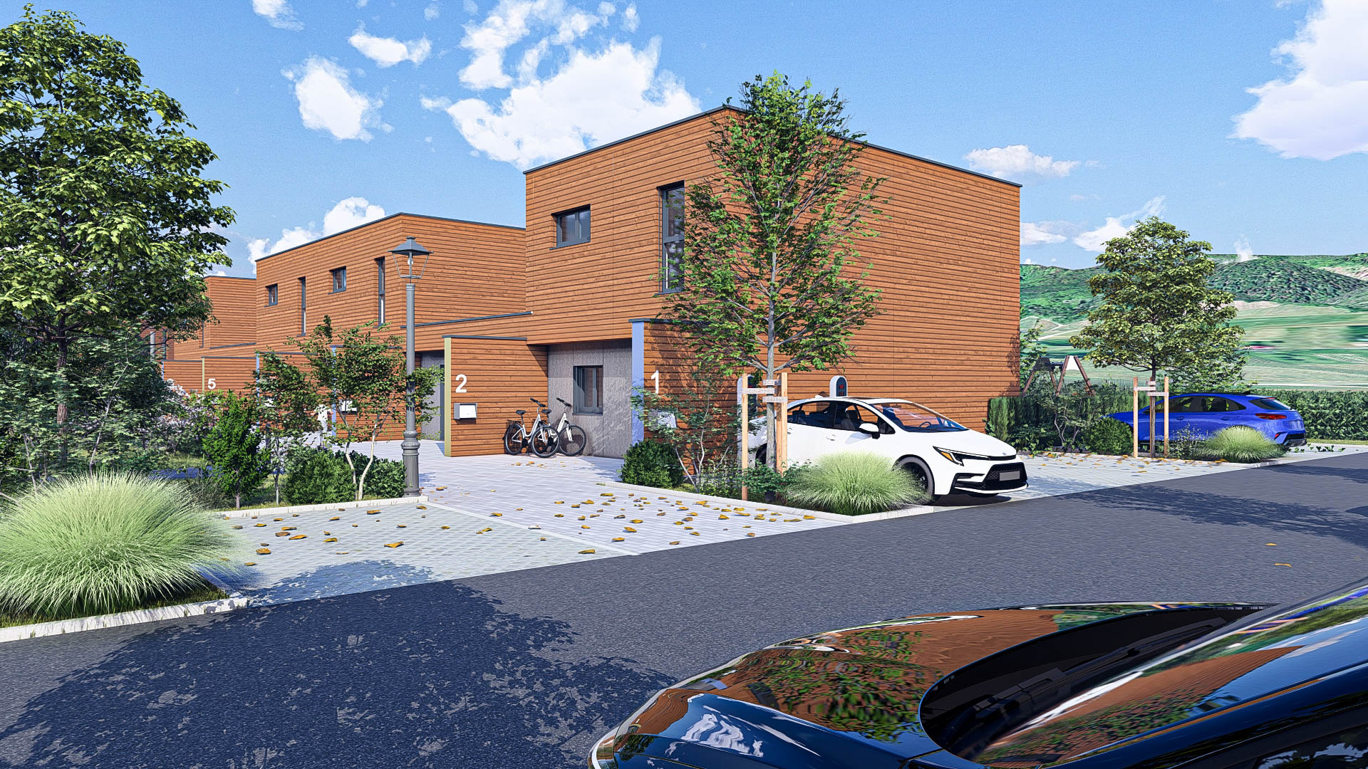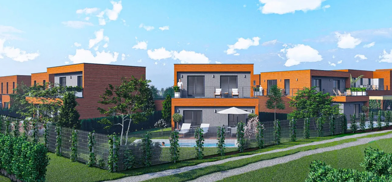Espaces extérieurs généreux et conviviaux. Pas de vis-à-vis gênant, écran végétal soigné et continuité paysagère. Les mobilités douces sont au cœur du projet : le quartier se parcourt facilement à pied ou à vélo.